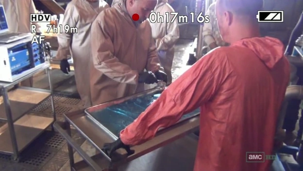 La metanfetamina producida por Walter se torna azul cuando él deja de usar reducción de pseudoefedrina y pasa a la aminación reductora. El color azul aparentemente es algo que forma parte de la trama, ideado por los escritores de la serie para hacer el producto de Walt visualmente identificable. La metanfetamina azul existe en la realidad, pero si el producto tuviese una pureza cercana al 100%, los cristales serían blancos o incoloros. El color azul podría ser resultante de impurezas formadas durante la reacción, pero a pesar del color, el producto de Walt es altamente puro.