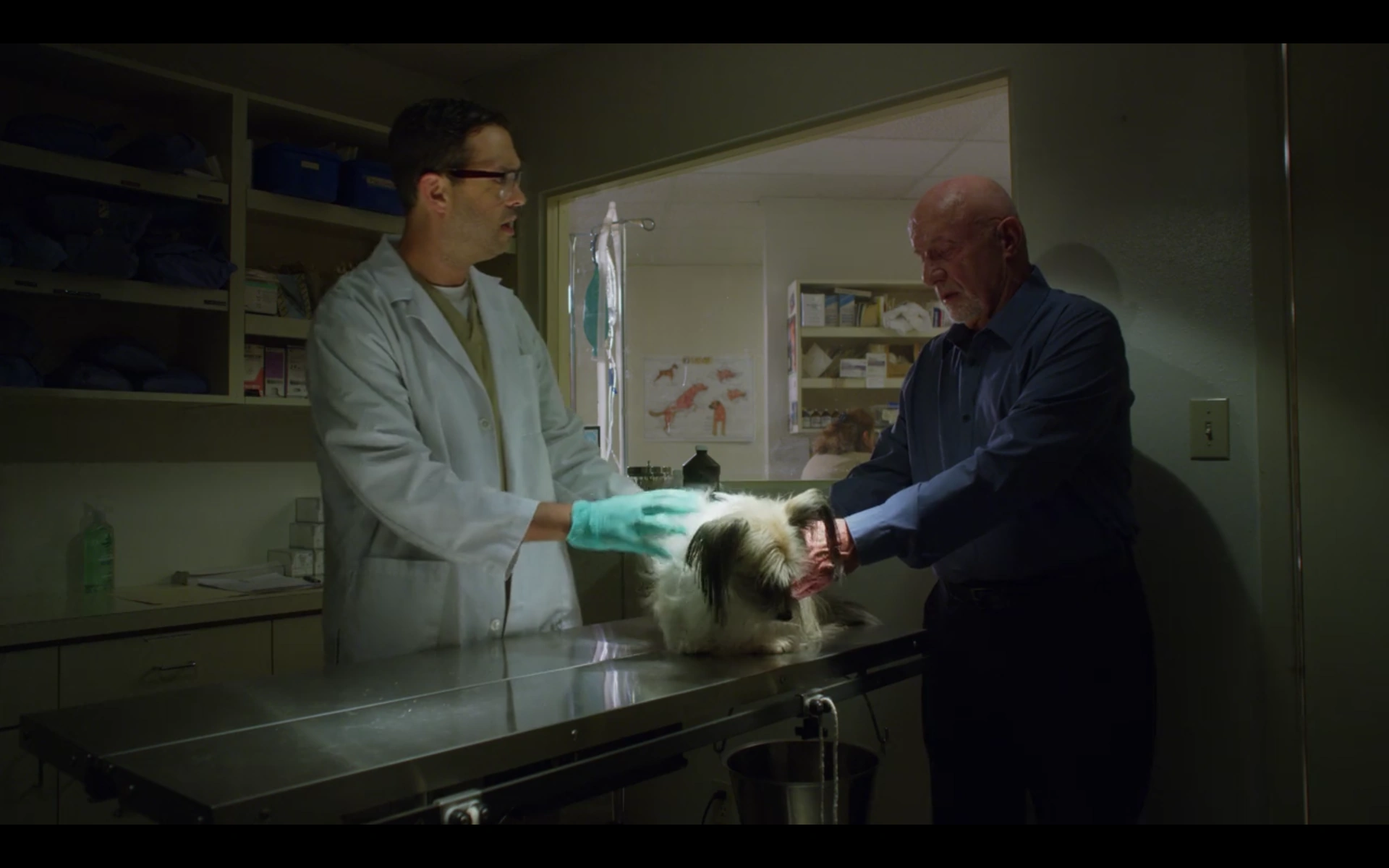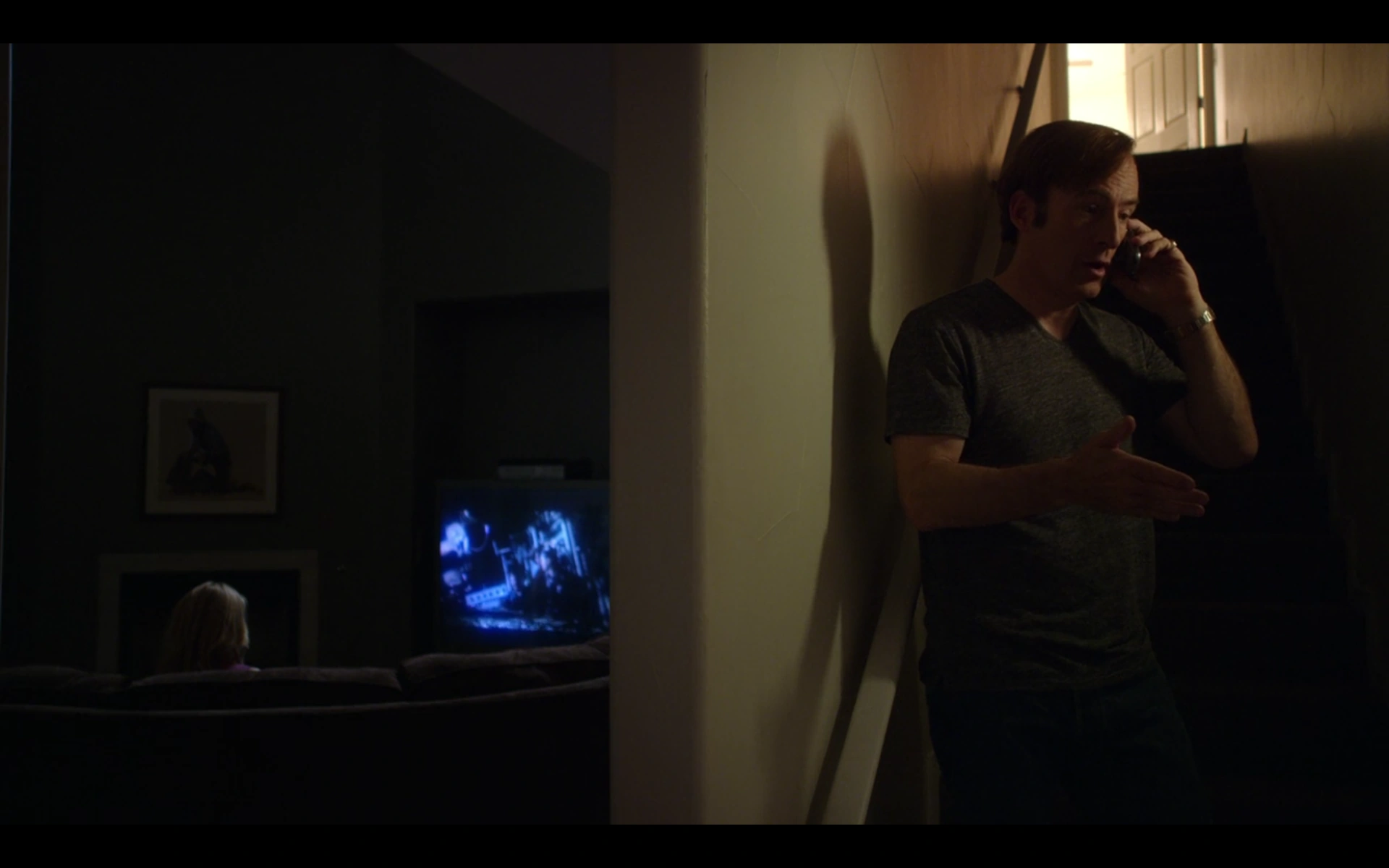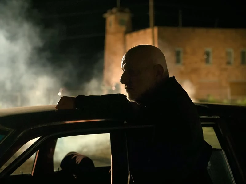 Jimmy and Kim watch the film Ice Station Zebra over wine and takeout. Their night is interrupted by a call to Jimmy’s cell phone. It’s Cliff, who is furious at Jimmy for airing a commercial without consulting him or his partners. Jimmy tries to smooth over the situation by pointing out the high volume of client traffic the commercial has already yielded. Cliff demands that Jimmy show the commercial to the partners the next morning before hanging up. For Kim’s benefit, Jimmy pretends that Cliff called to congratulate him on the ad. He rejoins her on the couch, doing his best to hide his concern about the storm he’ll be facing tomorrow. Meanwhile, Mike drives up to a desolate meet spot. He approaches his new employer: Nacho. He tells Mike, “There’s a guy. I need him to go away.”