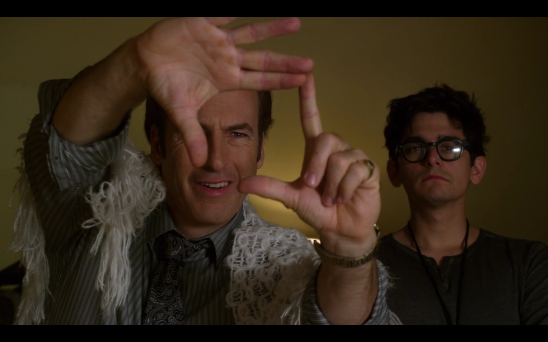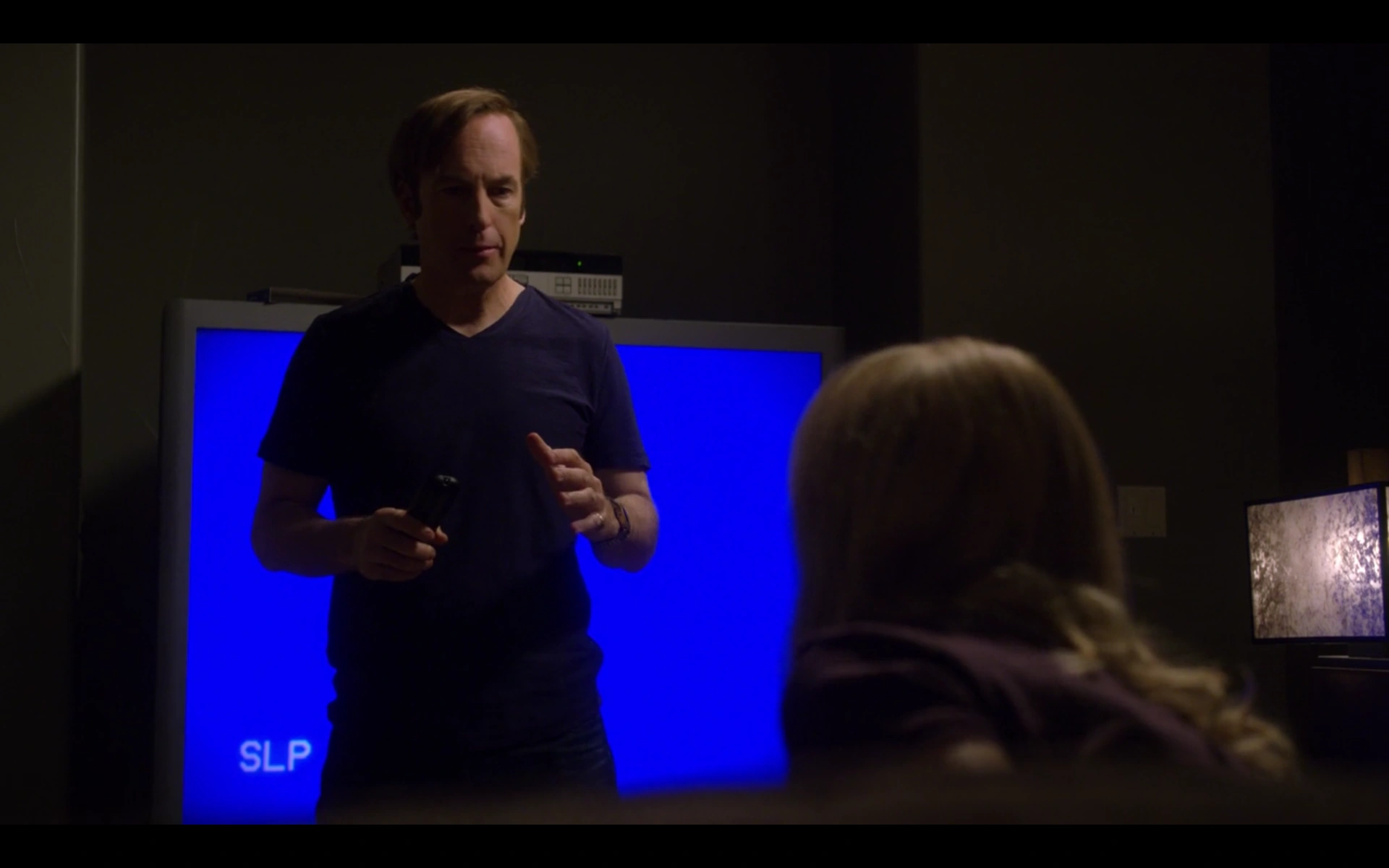 At his apartment, Jimmy and Kim screen his Sandpiper commercial, in which a somber Mrs. Strauss tearfully admits that her life savings disappeared when she moved to an assisted living facility. Kim is impressed, but is also surprised Cliff went along with it. “Why wouldn’t he be?” Jimmy asks, avoiding a direct response. The following day, at Davis & Main, Jimmy broods over whether to show the commercial to Cliff. He strides toward Cliff’s office with the VHS cassette in hand but stops short. He hastily returns to his own office and calls the ad sales department at a television station in Colorado Springs.