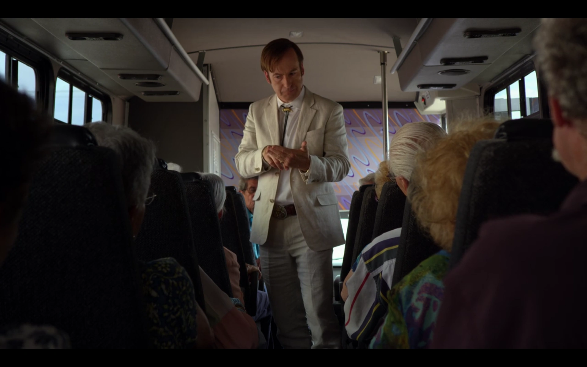 In Amarillo, Texas, Jimmy leans against the wall of a run-down building as a bus full of Sandpiper Crossing residents slows to a stop in front of him. The driver, who has been bribed by Jimmy to stop here, hops out, apologizing to his passengers for a "hiccup." Jimmy steps aboard, searching for a Mrs. Alma May Urbano and asking if she received a Davis & Main class action mailer concerning Sandpiper's overcharging. Other passengers overhear their conversation and pepper Jimmy with questions. He explains that Sandpiper may have overcharged them, too, and offers to help get their money back. Shortly thereafter, the seniors file off the bus at their restaurant destination, handing a pleased Jimmy their signed letters of engagement.
