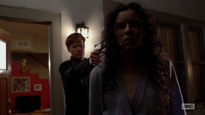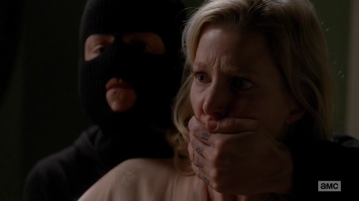 Skyler meets with a U.S. Attorney and members of the DEA, including Ramey, who press her for information on Walt's location in exchange for leniency. However, Skyler is unable to agree to the deal as she truly has no idea where Walt is. That night, the White residence is watched by the Albuquerque Police Department, who have maintained a constant surveillance on the house in the hopes of catching Walt. Skyler, who is in the living room, smokes a cigarette as she looks out the window and spots their cruiser. She then hears Holly cry and goes to tend to her, only to be startled by three masked men, one of whom covers Skyler's mouth from behind. Todd, who is one of the masked men, asks her if they're home alone, to which she nods, and then asks her if she'll scream if they let go of her mouth, and she indicates she will not. Her mouth uncovered, she tells them that Walt Jr. is at his friend's house for the week and begs for them not to harm her baby, but Todd tells her that they won't unless she gives them reason to. Todd asks her whether she's spoken to the authorities about Walt's criminal associates, including a "black-haired lady" that Skyler met previously at the car wash. When Skyler indicates that she has never spoken of her nor will she ever, Todd is satisfied. Upon receiving confirmation that she will not say anything to the police officers outside, Todd and the other two masked men leave through the window.