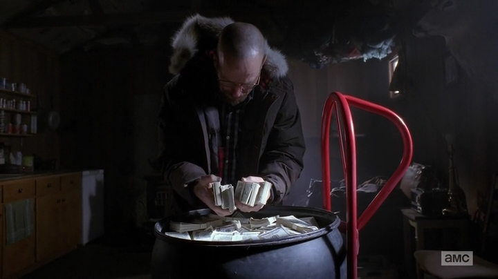 Months later, Walt greets Ed as he arrives for another supply drop. Now sporting a beard and full head of hair, he picks a new pair of glasses from a sampler case and reads through newspapers from Albuquerque. Ed informs him that Skyler has reverted to her maiden name and is working as a taxi dispatcher to make ends meet while she waits for her trial; while she retains custody of the children, they no longer live at 308 Negra Arroyo Lane, which was seized by the bank and had to be cordoned off as kids kept breaking in. Walt has been paying Ed to procure a homemade chemotherapy rig, injecting Walt with an IV drip. Ed then prepares to leave, prompting Walt to beg for him to stay, as he is lonely. Ed responds that he has a long trip back, but Walt offers him $10,000 to stay for two hours; Ed agrees to stay for one hour for $10,000. As Ed prepares a game of seven-card stud, Walt states that one day Ed would return only to find him dead from his cancer. He then motions to his multi-million dollar cash barrel and asks Ed whether he would deliver that barrel to his family after his death or keep it for himself; Ed merely asks Walt if he trusts him to do so. Ed eventually leaves and Walt falls asleep. Some time later, Walt wakes up to the sound of his wedding ring falling off his finger, which has thinned considerably. After fashioning it into a necklace, Walt notices a box that Ed had brought and fills it with $100,000 from the barrel. In the morning, he finally leaves the property and walks to the nearest town.