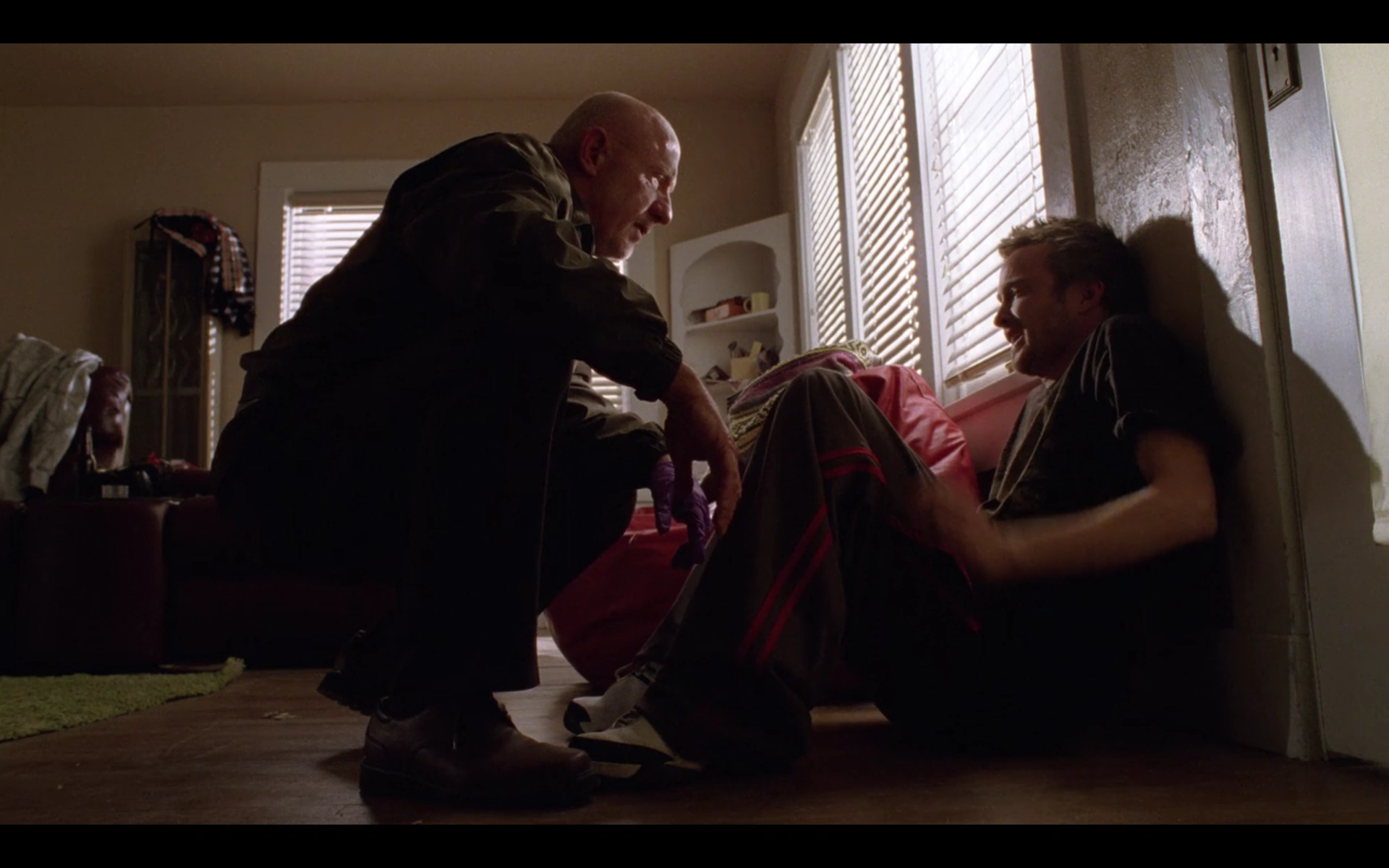 Jesse being coached by Saul's fixer Mike Ehrmantraut on how to respond to the medical investigators.