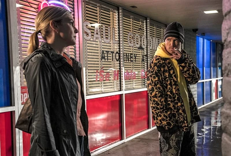Jesse notes Saul's shady advertising and, hoping that Saul can help Emilio avoid serving serious prison time, asks whether he is a legitimate attorney; Kim replies that Saul was when she knew him (as Jimmy McGill instead of Saul Goodman) before leaving, pulling over the hood of her raincoat and running to her car. ("Waterworks")