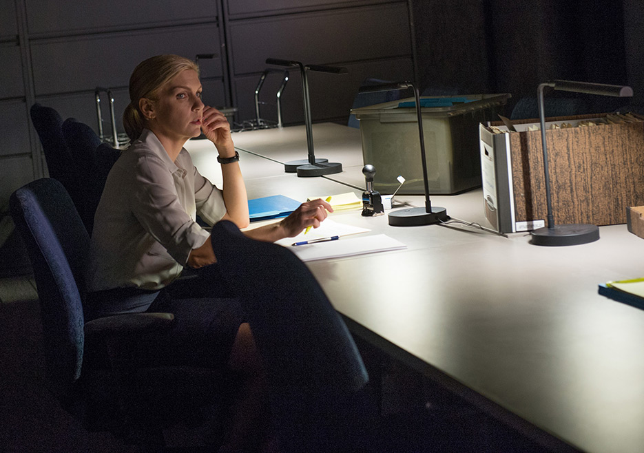 Howard sends Kim to document review as punishment and she takes it, working late into the night to where Jimmy, who'd been trying to contact her, finds her. He wants to get her out of the mess he's thrown her in, but Kim isn't having it, making him promise not to go to Howard. She's going to do her time and get out of there herself. ("Gloves Off")
