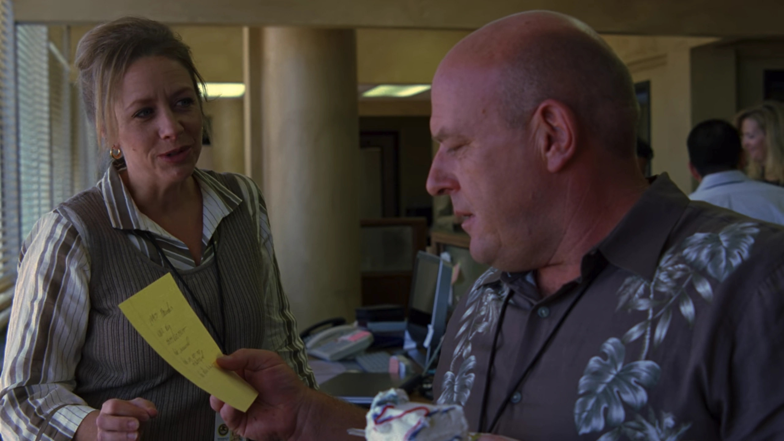 At the DEA field office the next day, Hank is dismayed when his final RV lead hits a dead end. He asks his secretary Janice to check again with the DMV to see if any RVs were overlooked during their first search. At the farewell party for Gomez, Hank hands him a statuette of Jesus Malverde, the patron saint of drug dealers, alluding to his experiences in Gomez's new beat of El Paso. Janice informs Hank that the DMV has indeed discovered an additional RV; its registration wasn't renewed, but the vehicle was never reported as non-operational, destroyed, or stolen.