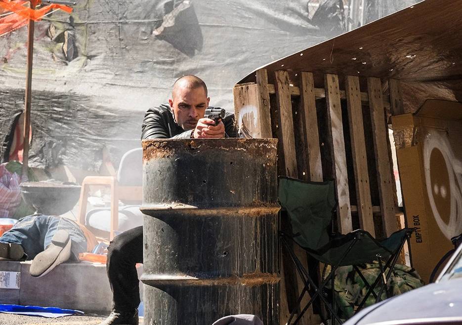 The following morning, Nacho hears footsteps outside his door. Paranoid, he hides for cover and aims his gun at the door. After a quick knock and the footsteps walking away, Nacho opens the door to find a neat tray of food placed outside. Nacho takes the tray before retreating back into the motel room. Looking outside the window, Nacho becomes suspicious of a shed nearby the motel—in particular a boarded-up window with a small peephole—which has a great viewpoint of his room.