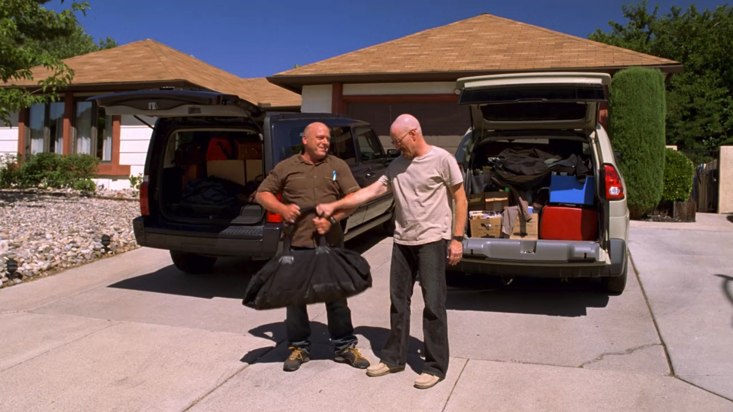 Hank visits the house to help with the move just as Walt fishes the last of the cash — and the plastic eyeball belonging to the pink teddy bear from the crash — out of his pool. Wrestling a duffel bag full of drug money away from his brother-in-law, Hank asks, "What have you got in there? Cinder blocks?" After a thought, Walt replies, "Half a million in cash." Hank laughs, assuming that Walt is joking.