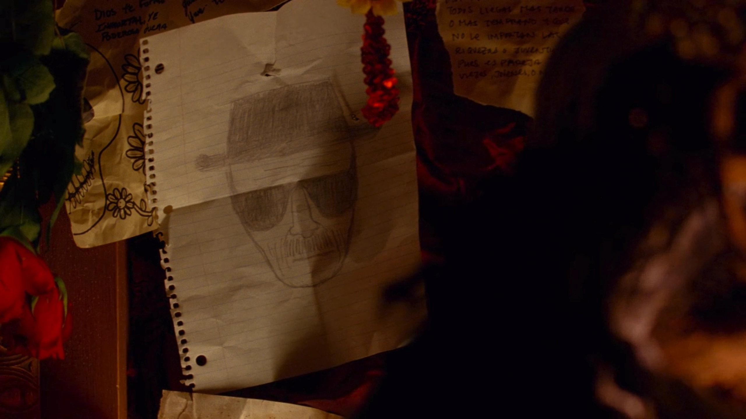 In a rural village in Mexico, men and women crawl on their bellies up a dusty, adobe-lined desert road. A Mercedes sedan stops alongside the procession. Two men exit the car; both wear expensive suits and cowboy boots tipped with silver skulls. The men begin to crawl with the others. The procession winds to a candlelit shrine to Santa Muerte, a Mexican folk deity representing death. The two men rise to their feet. One makes an offering, while the other pins something to the shrine: a crude sketch of Heisenberg.