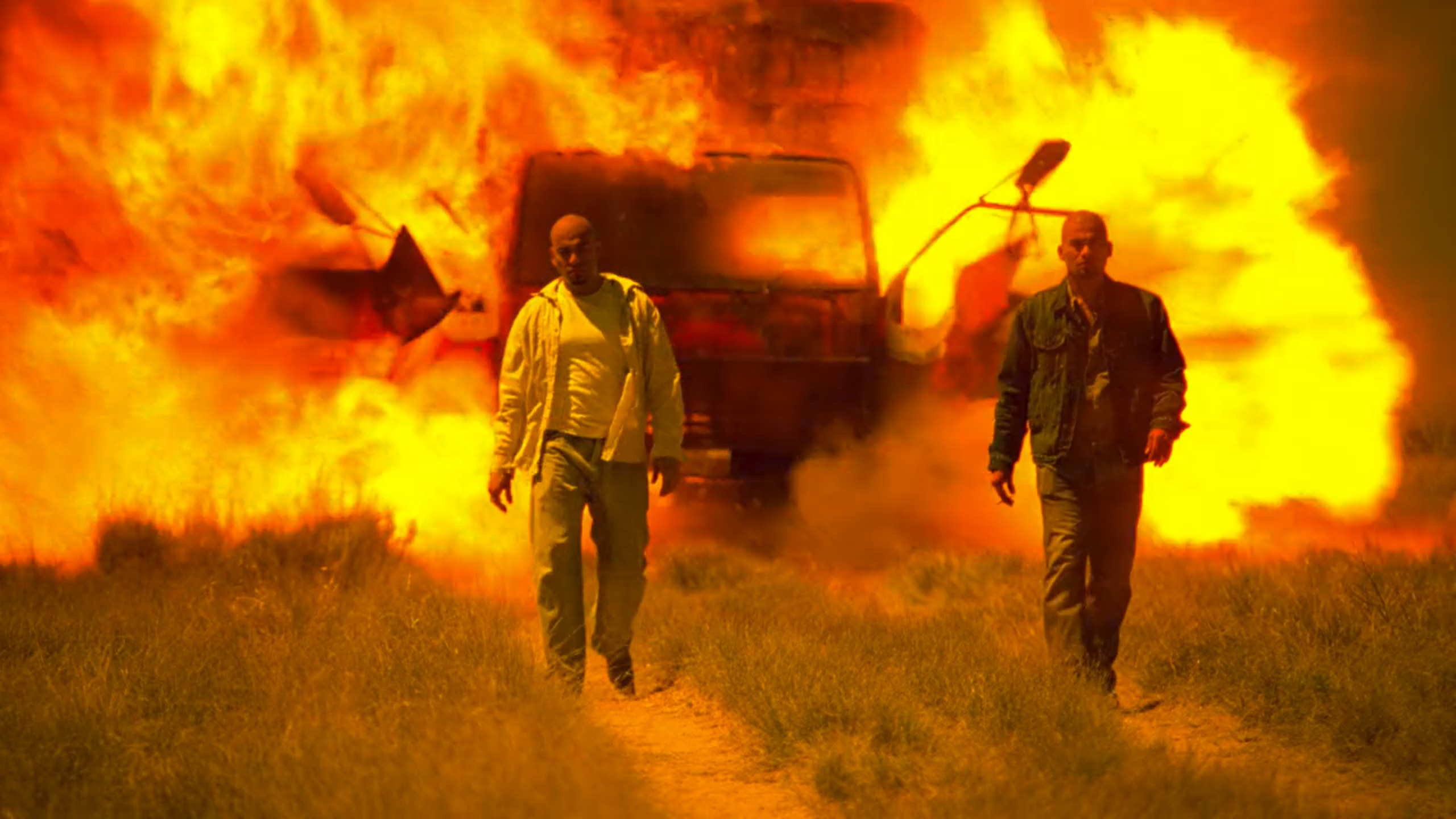 The Cousins after setting a truck and its murdered passengers ablaze. They walk away as the vehicle is engulfed in flames.