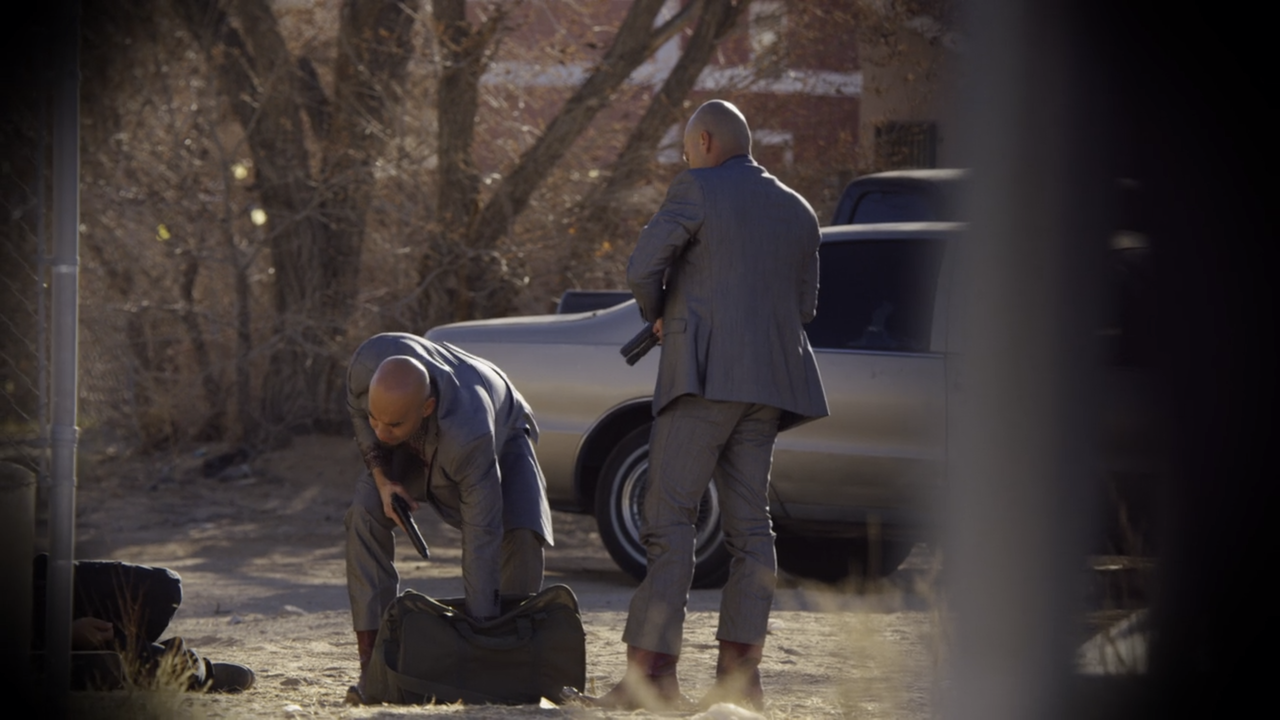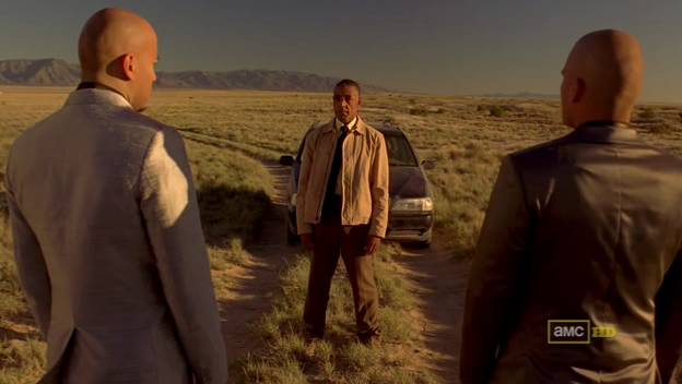 The Cousins collect Lalo's seven million dollar bail money from a chop shop. They later meet with Saul Goodman in desert spot designated by Lalo. After trading a slightly bemused look at Saul’s cheerful introduction in halting Spanish, they hand over to the two bulging bags of bail money before taking off again. ("Bagman")